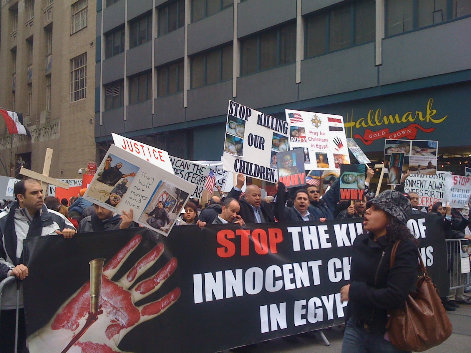中午隔壁埃及驻联合国代表团的小楼被数百埃及侨民围住,44街水泄不通。他们在抗议前几天埃及国内穆斯林枪击基督徒造成7死7伤的事件。拿了传单学习如下:类似事件在埃及经常发生,而政府袖手旁观甚至默许,当时警方声称10点后对任何事情都不负责;信奉基督教的科普特人Copts1445年以来一直遭受迫害。