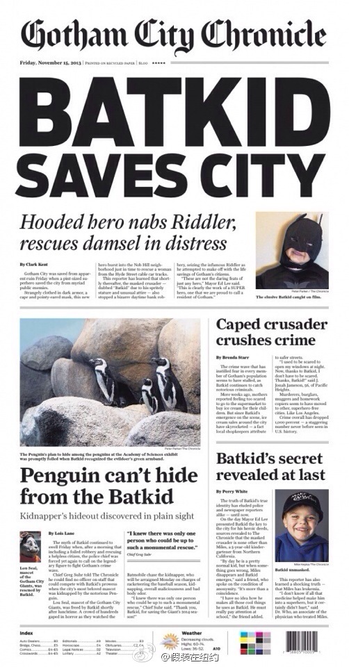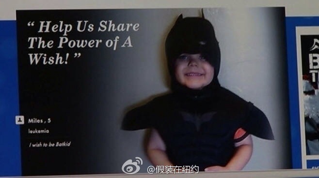 整个旧金山为5岁白血病男孩圆梦 为了帮患白血病的5岁男孩Miles实现做蝙蝠侠拯救世界的梦想,今天旧金山变成了哥谭市,上万志愿者配合出演,蝙蝠侠Miles坐着警方护送的兰博基尼穿越城市,完成英雄救美、勇抓劫匪、救吉祥物等任务,最后受到华裔市长李孟贤的表彰。倾尽全城之力帮一个孩子圆梦,很久没看到过这么温暖的新闻了。 组织者非常有心,还特别制作了一期其实并不存在的“哥谭市纪事报”,头版刊登的全是小蝙蝠侠的英雄事迹。奥巴马也在关注这件事,下午在推特上转发了小蝙蝠侠出场的照片。 相关文章: 哈佛大学图书馆针对不断有中国学生来寻找所谓哈佛馆训 乔治·克鲁尼威武 洛杉矶市议会全票禁止沃尔玛进驻中国城 Anderson Cooper刚刚正式宣布出柜