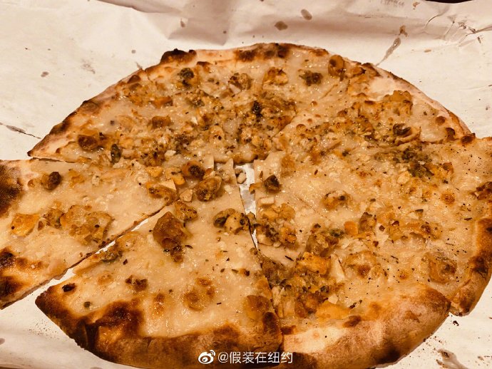 开了100公里车,到达店里时是傍晚5点,店门口又已经排起了长队。我们和五年前一样点了White Clam,面饼里混了蒜汁和蛤蜊汁,披萨上放了超多的蛤蜊肉。这家Pizza的size非常大,最小的就有12英寸,最大的18英寸,29.5美元一个,连盒子足足有一张桌子那么大。